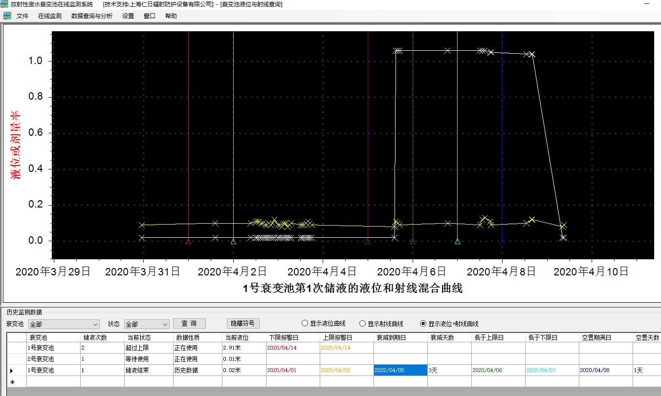 监测软件自动计算衰变池从开始注液到排放结束的七个不同时期,并分别给出警示
